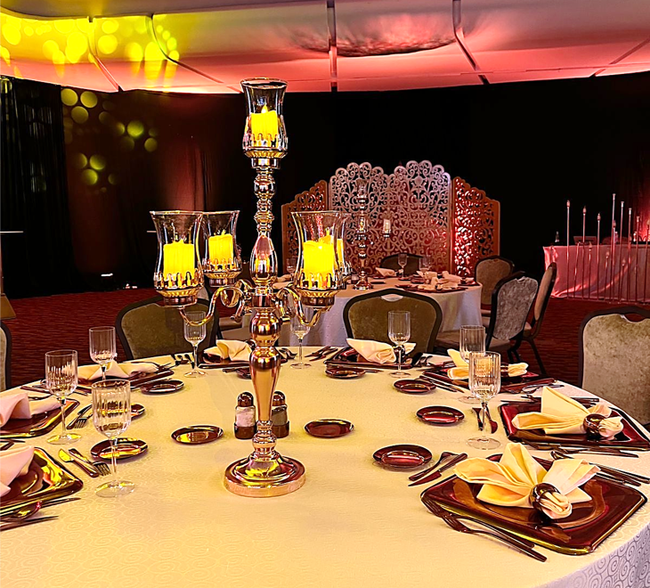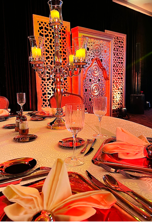 Dans le cadre prestigieux de l’hôtel La Cigale, nous avons orchestré un dîner de gala somptueux sous le signe de l’élégance orientale. Un décor envoûtant mêlant tentures en velours, lanternes ajourées et touches dorées plongeait les convives dans une ambiance digne des Mille et une nuits. L’expérience était sublimée par une scénographie lumineuse tamisée, une table raffinée ornée de roses et de dorures, et une animation immersive avec des mélodies andalouses, des danseuses orientales et un live band envoûtant.